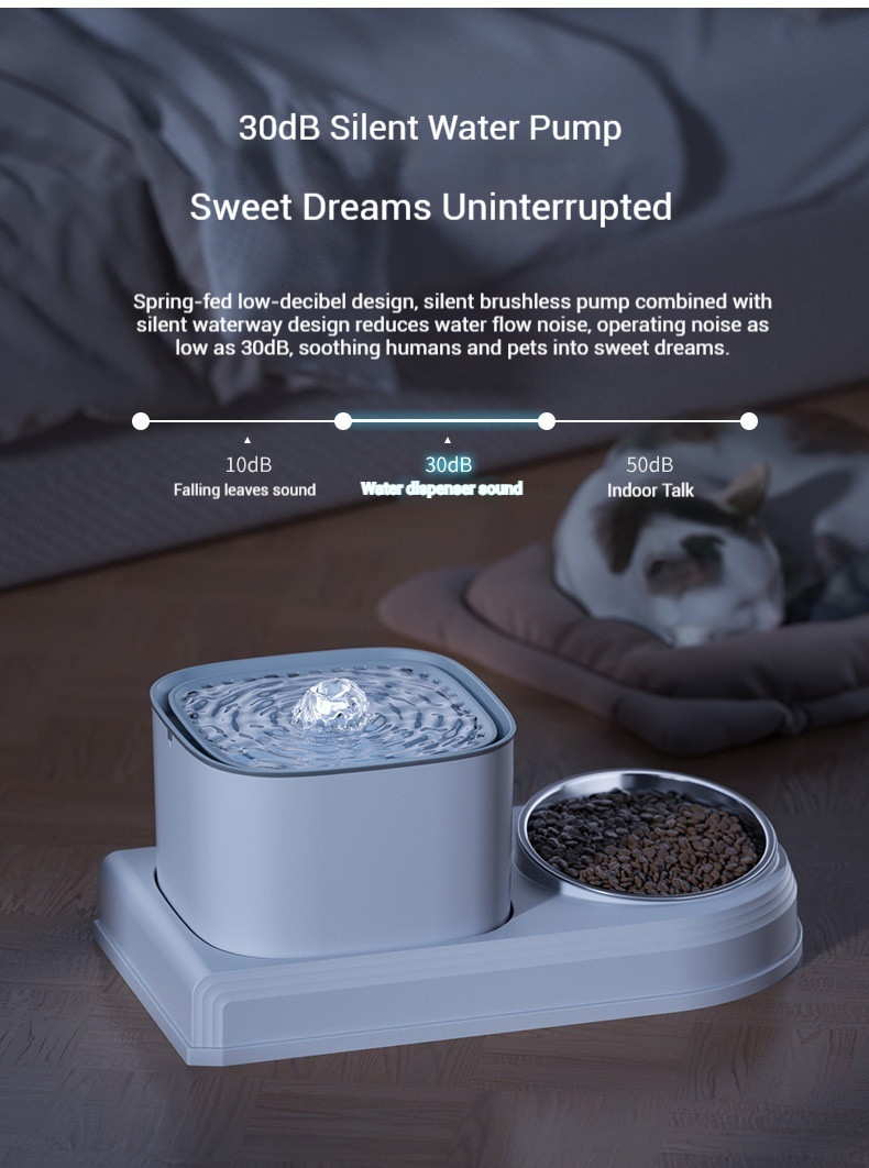 - ترطيب هادئ للغاية: أ تصميم منخفض الديسيبل يعمل بالزنبرك يتميز بـ مضخة صامتة بدون فرشاة مدمجة مع تصميم ممر مائي صامت الذي يقلل من ضوضاء تدفق المياه. يعمل عند أقل من 30 ديسيبل, إنه هادئ بما يكفي لتهدئة البشر والحيوانات الأليفة وإدخالهم في أحلام سعيدة دون إزعاج.