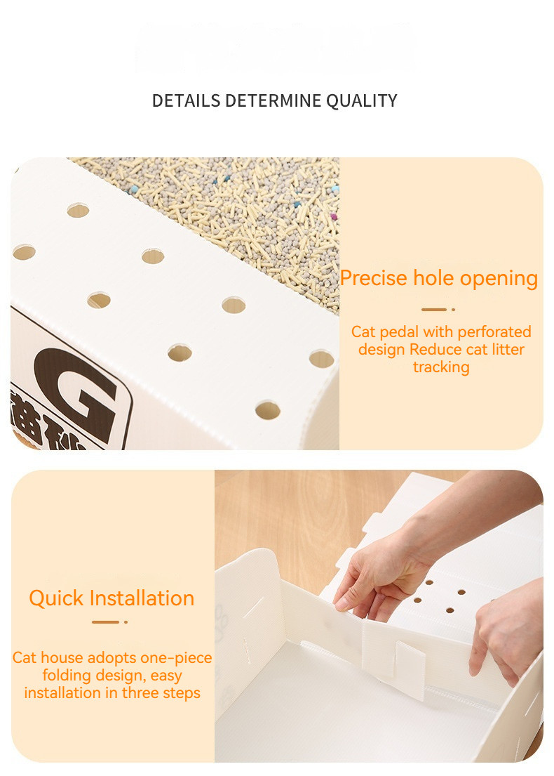 But the innovation doesn’t stop there. We’ve included a precise hole opening—a cat pedal with a perforated design that effectively reduces cat litter tracking, keeping your floors cleaner. Best of all, setup is a breeze. The cat house adopts a one-piece folding design, allowing for quick installation in just three steps—no tools or complicated assembly required.